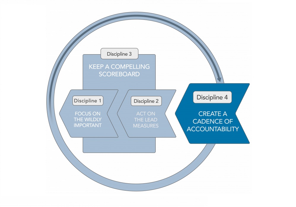 The cadence of accountability is a rhythm of regular and frequent team meetings that focus on the Wildly Important Goal®. These meetings happen weekly, sometimes daily. They ideally last no more than 20 minutes. In that brief time, team members hold each other accountable for commitments made to move the score.